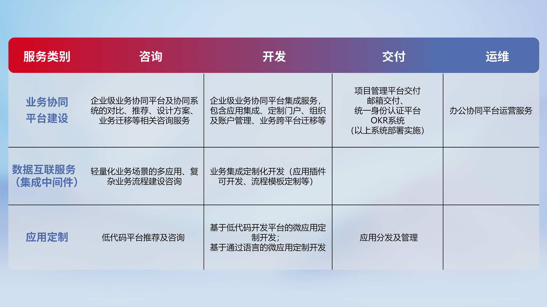 针对钉钉、、企微、、、、IDaas等平台级产品提供产品的规划、、方案、、、交付、、、、定制化开发等服务,,,实现如统一协同办公、、、智能客户服务、、、、混合会议管理、、、智能数据查询、、等业务场景,,,实现数字化转型。。