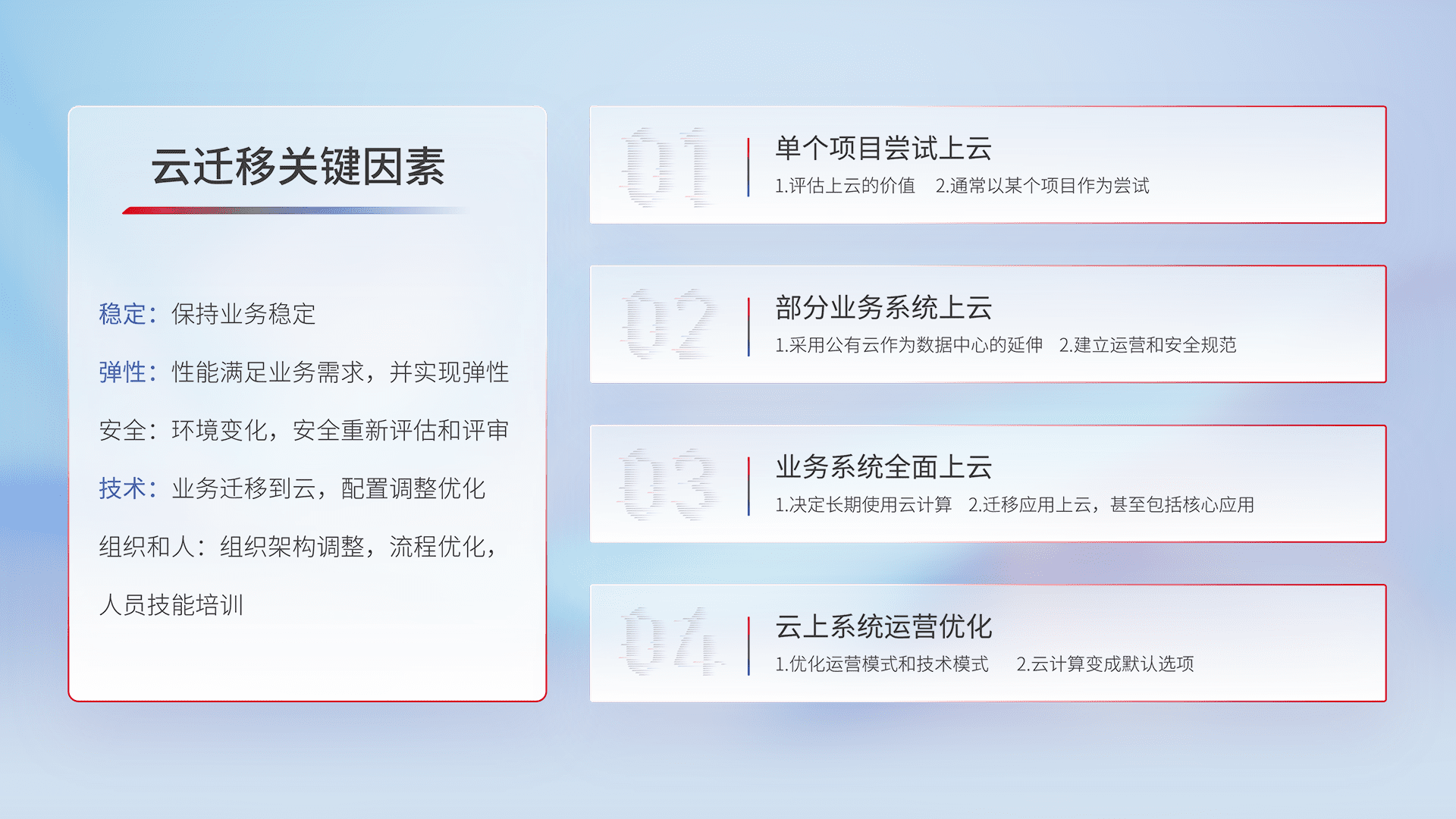 结合实际业务,,,,从规划设计、、、、云平台选型、、、云原生改造、、数据迁移、、集成交付,,迁移全过程为客户识别最佳上云路径,,,做好风险识别管理,,设计网络架构、、、、身份权限、、、安全审计合规、、、、操作审计、、、日志审计、、、监控告警策略、、多站点容灾设计等,,,,对云上基础设施进行整体规划,,,提升IT治理水平,,以满足弹性、、、、高可用、、、、高性能的需求。。。。