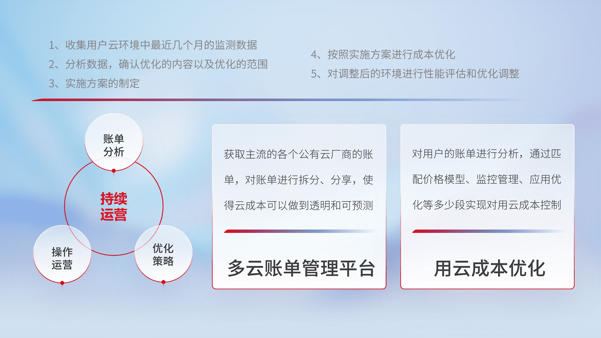 通过多云纳管,,,以统一的资源数据模型把客户的云资源进行抽象和封装,,进而实现对多云资源的统一操作,,保障云资源管理的可靠性、、、、稳定性与可用性。。。量身定制化运维内容,,,配置、、、开发运维、、补丁管理、、备份、、、监控、、、、认证和访问管理、、、、审计和日常巡检等,,,,保障在用云过程中的可靠度,,,稳定度以及高可用率。。。。